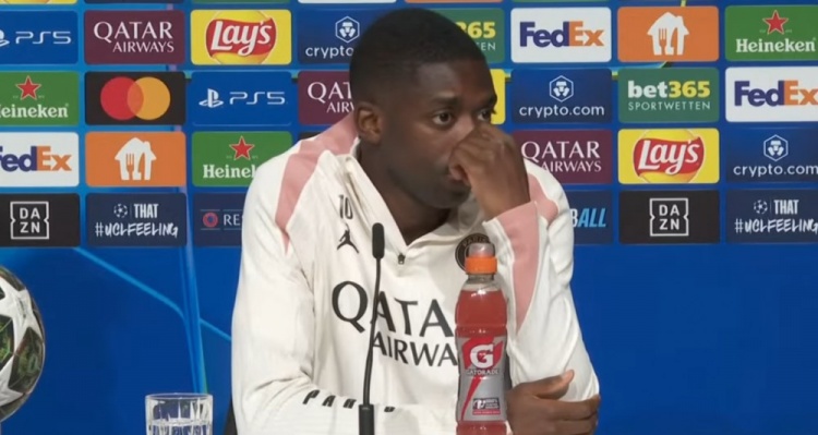欧冠决赛赛前,巴黎攻击手登贝莱出席了新闻发布会。